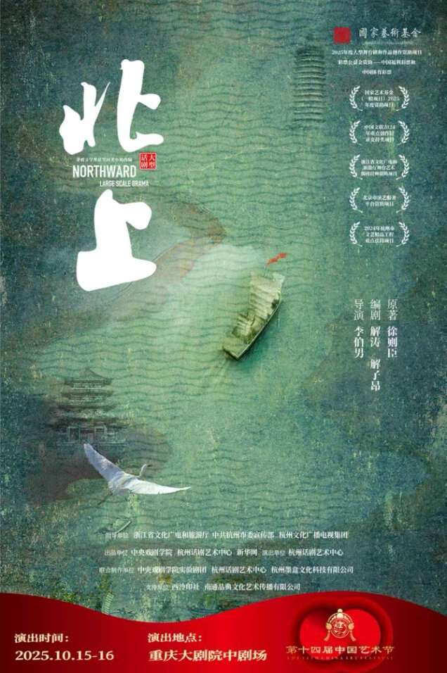 《北上》由中央戏剧学院、杭州话剧艺术中心、新华网联合出品,中央戏剧学院实验剧团、杭州话剧艺术中心、杭州墨盒文化科技有限公司联合制作。自2024年9月杭州首演以来,《北上》已走过北京、上海、淮安、昆山、湖州、宁波等运河流域城市,秉持“不断打磨、持续淬炼”的创作理念,在剧本、表演、舞美等多方面反复推敲、精益求精。